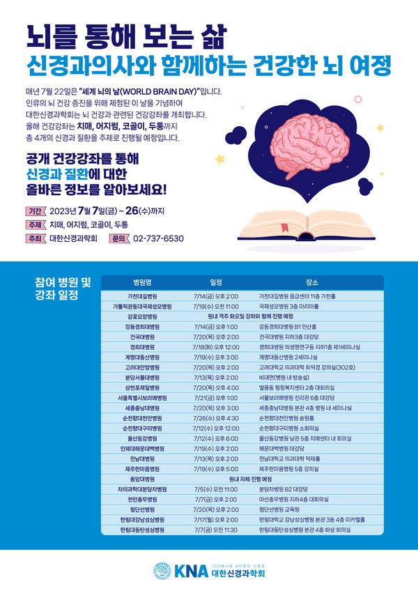 [뉴스인] 조진성 기자 = 대한신경과학회(이사장 김재문)는 7월 22일 세계 뇌의 날(World Brain Day)을 기념해 7월7일부터 26일까지 21일간 ‘뇌를 통해 보는 삶: 신경과 의사와 함께하는 건강한 뇌 여정’ 건강강좌를 개최한다고 밝혔다.