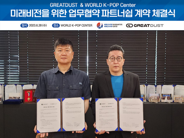 [뉴스인] 조진성 기자 = (주)월드케이팝센터(대표 박성진)와 (주)그레이트더스트(대표 채웅조)가 미래비젼을 위하여 전략적 파트너쉽 계약을 체결했다.
