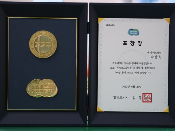 [뉴스인] 조진성 기자 = 경기도 광주시 소재의 더 플러스병원 박상욱 병원장이 코로나19 감염병관리와 예방접종을 통해 감염병 유행 차단 및 시민들의 보건의료서비스 향상에 기여한 공을 인정받아 지난달 27일 '경기도 지사 표창장'을 수상했다.