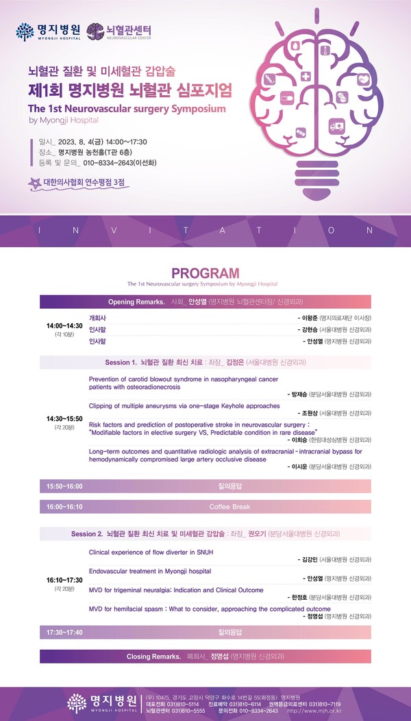 뇌혈관 질환 및 미세혈관 감압술을 주제로 개최되는 이번 심포지엄에는 명지병원과 서울대병원, 분당서울대병원 신경외과 의료진이 참여해 최신 치료 증례 및 다양한 연구 성과를 소개한다.