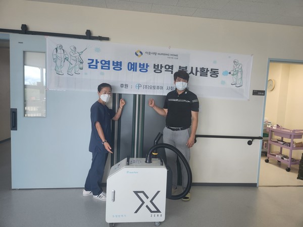 이날 방역 봉사는 ㈜ Auto Pure(대표 최윤영)의 사회공헌사업의 일환으로 진행했으며 이를 계기로 두 기관은 상호 업무협약을 맺고 요양원에 계시는 어르신을 위한 감염예방을 위해 지속적으로 방역을 지원하기로 했다.