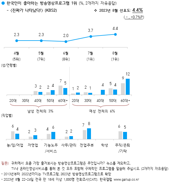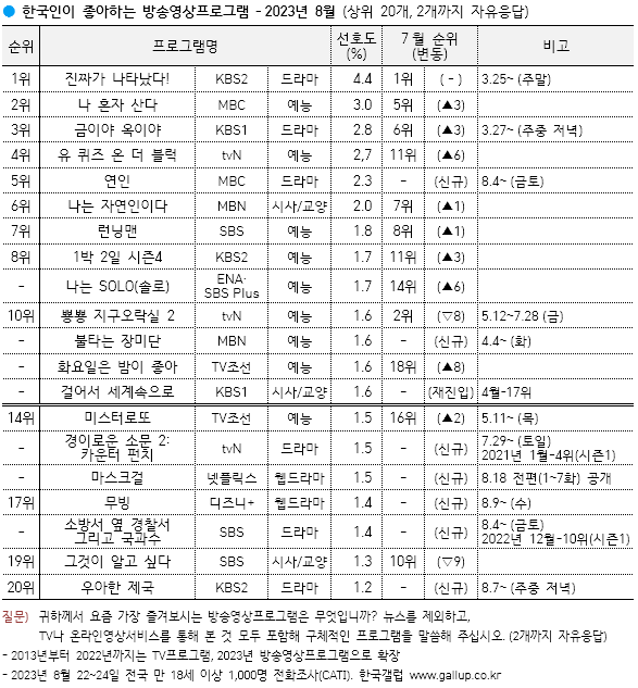[뉴스인] 김태엽 기자 =한국갤럽이 2023년 8월 22~24일 전국 만 18세 이상 1,000명에게 요즘 가장 즐겨보는 방송영상프로그램을 물은 결과(2개까지 자유응답), KBS2 주말 드라마 〈진짜가 나타났다!〉가 선호도 4.4%로 두 달 연속 1위를 차지했다.