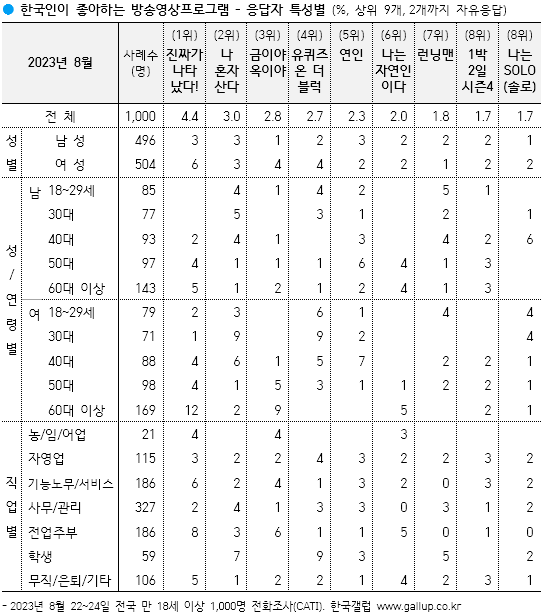 - 2023년 8월 좋아하는 방송영상프로그램 2위: MBC 예능 〈나 혼자 산다〉 3.0%