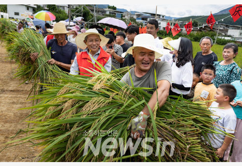 [뉴스인/신화통신] 민경찬 기자 = 지난 2일(현지 시간) 중국 쓰촨성 옌볜의 한 논에서 농민들이 수확한 벼를 안고 풍작을 기뻐하고 있다. 이날 풍년절 행사가 열려 마을 사람들과 여행객들이 벼 베기 대회, 논 음악회 등 다채로운 행사에 참여했다.