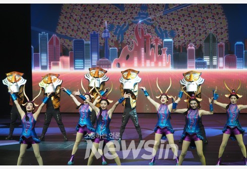 [뉴스인/신화통신] 민경찬 기자 = 5일 중국 상하이의 디즈니랜드 '주토피아' 단지 시공 발표 현장에서 무용단이 축하 공연을 펼치고 있다.