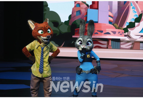 [뉴스인/신화통신] 민경찬 기자 = 5일 중국 상하이의 디즈니랜드 '주토피아' 단지 시공 발표 현장에 여우 '닉'과 토끼 경관 '주디'가 인사하고 있다.