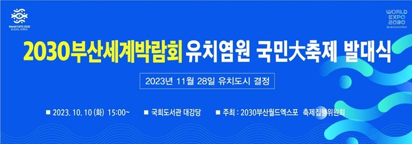 ’2030 엑스포 유치 국민대축제‘ 는 오는 10일, 국회도서관 강당에서 발대식을 갖고 130여 명의 각계각층 오피니언 리더들을 집행위원으로 위촉하는 등 조직을 완비한 뒤, 유치 결정 당일인 11월 28일 개최지인 부산에서 열릴 본행사까지 온 국민이 힘을 모아 ’자발적 서포터즈‘로 나설 것을 다짐할 예정이다.