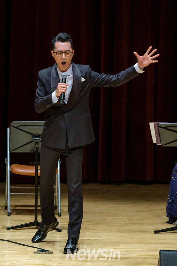 [뉴스인] 민경찬 기자 = i-신포니에타(단장 조화현)의 테너 정진성이 27일 저녁 인천 연수구 연수아트홀에서 열린 '우리가족 해피 콘서트'에서 뮤지컬 지킬 박사와 하이드 중 '지금 이 순간'을 연주하고 있다.