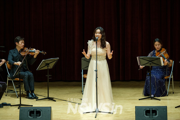 [뉴스인] 민경찬 기자 = i-신포니에타(단장 조화현)의 소프라노 정수진이 27일 저녁 인천 연수구 연수아트홀에서 열린 '우리가족 해피 콘서트' 중 이미자의 '섬마을 선생님'을 들려주고 있다.