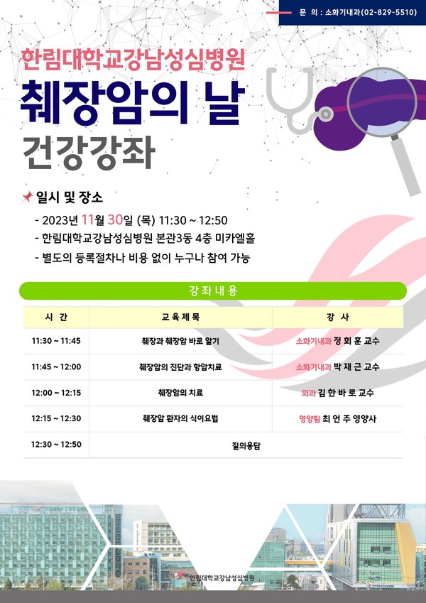 [뉴스인] 조진성 기자 = 한림대학교강남성심병원(병원장 이영구)은 오는 30일 오전 11시30분 본관3동 4층 미카엘홀에서 세계 췌장암의 날을 맞아 건강강좌를 개최한다.