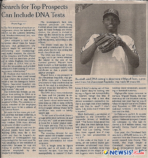 뉴욕타임스는 22일(현지시간) A섹션 1면과 16면에 ‘메이저리그가 선수 스카우트를 할 때 신원확인을 위해 시행하는 유전자 테스트가 개인프라이버시 침해로 지적을 받고 있다“고 전했다.