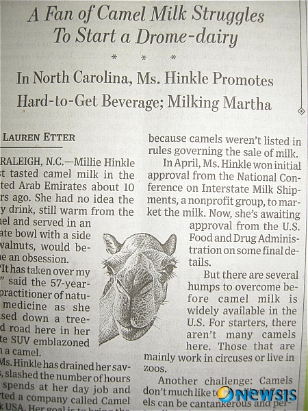 월 스트리트 저널(WSJ)은 22일(현지시간) A섹션 1면과 12면에 “중동 지역에서 일반화된 낙타유가 미국 상륙을 앞두고 있다면서 미 식품의약국(FDA)의 승인을 받는대로 시판될 예정”이라고 보도해 관심을 끌었다.