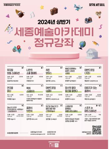 2024년 상반기 세종예술아카데미 정규강좌는 3월 18일부터 진행되며 수강 접수는 2월 14일(수) 14시부터 시작된다.