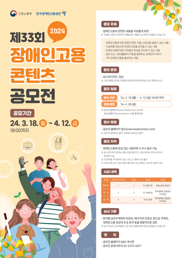 [뉴스인] 윤은중 기자 =고용노동부와 한국장애인고용공단(이사장 조향현, 이하 ‘공단’)이 ‘2024년 제33회 장애인고용 콘텐츠 공모전’을 개최한다.