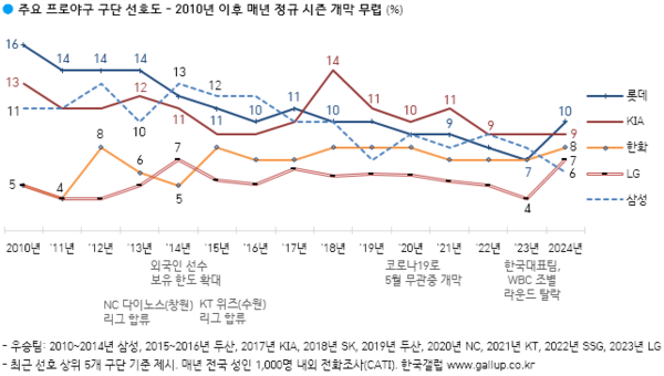 롯데 자이언츠와 LG 트윈스 선호도는 작년 대비 각각 3%포인트 상승, NC 다이노스도 2%포인트 상승한 반면, 삼성 라이온즈는 2%포인트 하락했다. 그 외 구단은 모두 1%포인트 이내 등락했거나 변함없었다. 1998년 이후 구단 선호도 추이를 보면 롯데는 2008·2010년 16%에서 2023년 7%까지 점진 하락했고, LG는 1998년 12%가 최고치, 2011·2012·2023년의 4%가 최저치다. 즉, 두 구단은 나란히 선호도 최저선에서 벗어났다는 데 주목할 만하다.