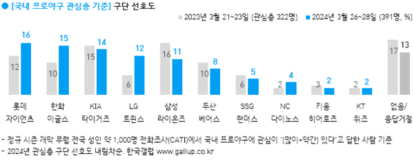 국내 프로야구 관심층(391명)이 좋아하는 구단은 롯데(16%), 한화(15%), KIA(14%), LG(12%), 삼성(11%), 두산(8%), SSG(5%), NC(4%), 키움과 KT(이상 2%) 순이다. 관심층에서는 작년 대비 롯데·한화·LG 선호도가 각각 5%포인트 안팎으로 올랐고, 삼성은 5%포인트 내렸다.