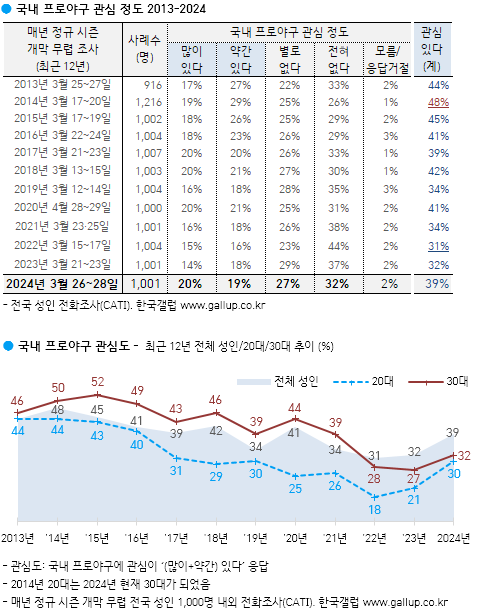 국내 프로야구 관심 정도(4점 척도)는 '많이 있다' 20%, '약간 있다' 19%, '별로 없다' 27%, '전혀 없다' 32%며 의견 유보가 2%다. 2013년 이후 매년 정규 시즌 개막 무렵 기준 국내 프로야구 관심도('(많이+약간) 있다' 응답)는 2014년 48%가 최고치, 2022년 31%가 최저치다. 2023년 작년 조사 직전에는 야구 한국대표팀의 WBC 조별 라운드 탈락 등 충격이 있었으나, 당시 국내 프로야구 관심도(32%)는 재작년과 비슷해 수년간 이어진 하락세가 멈춘 듯했고 올해는 2016~2018년, 2020년 수준으로 반등했다.