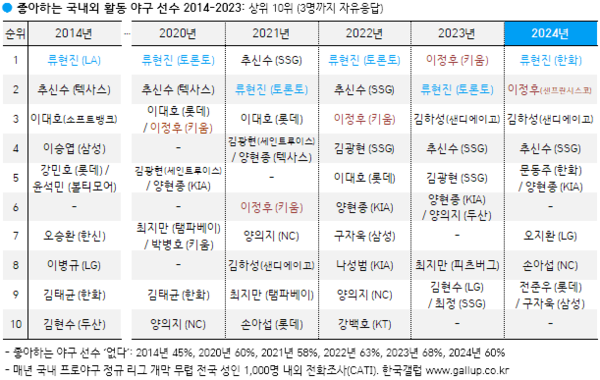 국내외에서 활동 중인 우리나라 야구 선수 중에서 좋아하는 선수를 물은 결과(3명까지 자유응답), '류현진'이 선호도 20%로 1위에 올랐다. 그는 KBO리그를 거쳐 메이저리그로 진출한 최초의 선수며, 특유의 친근한 이미지로도 많은 팬을 확보하고 있다. 2006년 한화 이글스 입단, 2012년 12월부터 LA 다저스 소속, 2019년 12월 토론토 블루제이스로 옮겨 메이저리거로 활약했고 올해 KBO리그로 되돌아왔다. 그는 매년 초 선호 국내외 활동 야구 선수 조사에서 2013·2014년 1위, 2020~2024년 연속 1~2위를 차지했다.