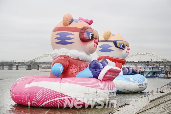 [뉴스인] 민경찬 기자 = 16일(현지시간) 중국 헤이룽장성 하얼빈에 '제9회 동계아시안게임' 마스코트 '니니(妮妮)'와 '빈빈(濱濱)'의 대형 풍선 조형물이 쑹화강 강변에 등장해 눈길을 끌고 있다. 이 조형물은 높이 18m, 지름 23m에 달하는 것으로 전해졌다. (사진=신화통신)