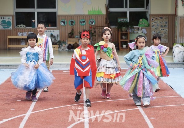[뉴스인] 민경찬 기자 = '지구의 날'(22일)을 앞둔 19일(현지시간) 중국 저장성 주지의 한 유치원에서 환경보호 행사가 열려 폐상자와 비닐로 만든 옷을 입은 어린이들이 환경보호 패션쇼를 하고 있다. 이날 행사에서는 환경보호 주제 포스터 그리기, 폐품 장난감 만들기, 환경보호 의상 전시 등 다양한 활동이 펼쳐졌다. (사진=신화통신)
