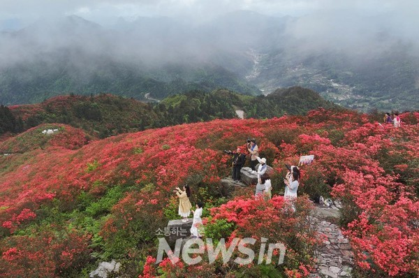 [뉴스인] 민경찬 기자 = 20일(현지시간) 중국 구이저우성 단이현 룽취안산의 진달래꽃밭을 찾은 관광객들이 만개한 진달래를 감상하고 있다. 최근 구이저우성 고산 지대에 진달래가 만개해 각지의 관광객을 불러 모으고 있다. (사진=신화통신)