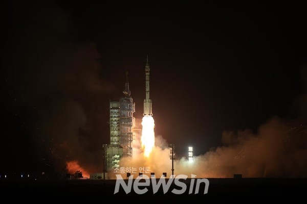 [뉴스인] 민경찬 기자 = 25일(현지시간) 중국 간쑤성 주취안 위성발사센터에서 유인우주선 선저우 18호를 실은 창정 2F 야오 로켓이 발사되고 있다. (사진=신화통신)