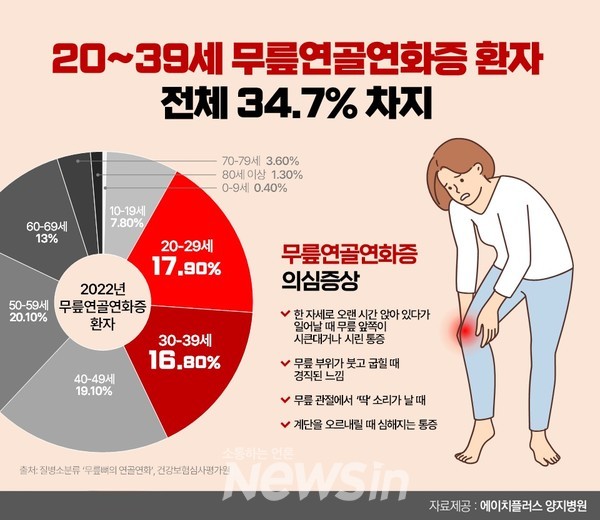[뉴스인] 민경찬 기자 = 무릎 관절은 나이가 들수록 퇴행성 변화가 생기고 한번 손상된 연골은 다시 재생되지 않기에 젊을 때부터 관리가 필요하다. 특히 무릎 질환은 일반적으로 중장년층 이후 많이 발생하는 것으로 알려졌지만, 연골연화증은 최근 활동량이 많은 젊은 연령대에서도 많이 발생하고 있어 주의해야 한다.