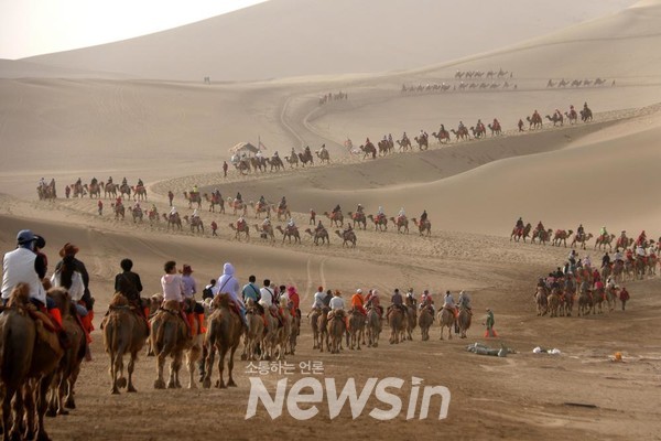 [뉴스인] 민경찬 기자 = 19일(현지시간) 중국 간쑤성 둔황시 밍사산 웨야취안에서 낙타를 탄 여행객들이 사막을 관광하고 있다. 이날 '마음껏 유람하는 중국, 행복한 삶'을 주제로 제14회 '중국 관광의 날' 행사가 열렸다. (사진=신화통신)