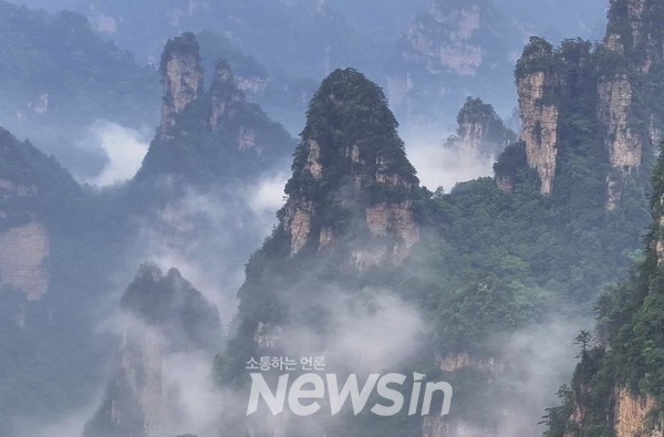 [뉴스인] 민경찬 기자 = 21일 새벽(현지시간) 중국 후난성에 비가 내린 후 장자제(장가계) 국가삼림공원 산과 숲 사이로 안개가 피어올라 한 폭의 그림 같은 풍경이 연출되고 있다. (사진=신화통신)
