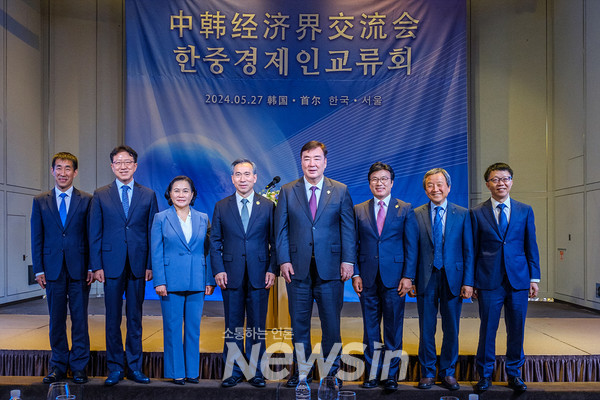 [뉴스인] 민경찬 기자 = 27일 오후 서울 장충동 앰배서더 서울 풀만 호텔 그랜드볼룸에서 한중경제인교류회가 열려 내빈들이 기념 촬영하고 있다. 왼쪽부터 왕치림 중국경제상무처 경제공사, 황득규 삼성의료재단 이사장, 유명희 전 산업통상자원부 통상교섭본부장, 런훙빈 중국국제무역촉진위원회 회장, 싱하이밍 주한중국대사, 지영모 한중민간경제협략포럼 이사장, 김대환 세계자동차엑스포 조직위원장, 윤위우 한국중국상회 회장.