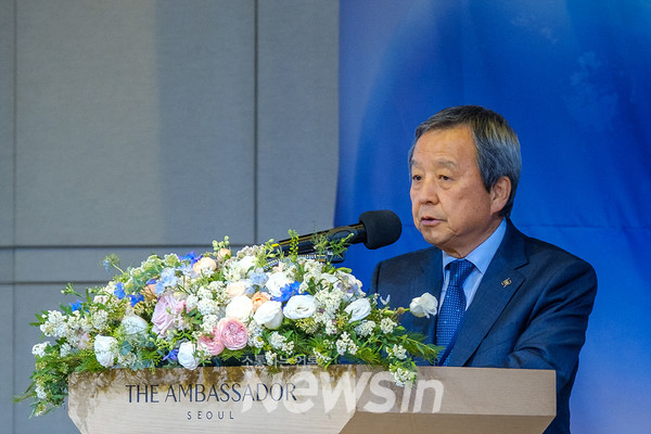 [뉴스인] 민경찬 기자 = 27일 오후 서울 장충동 앰배서더 서울 풀만 호텔 그랜드볼룸에서 한중경제인교류회가 열려 김대환 세계 e-모빌리티협의회·세계전기차연맹 회장이 한중 공급망 관련 협력 및 향후 전망에 관해 연설하고 있다.