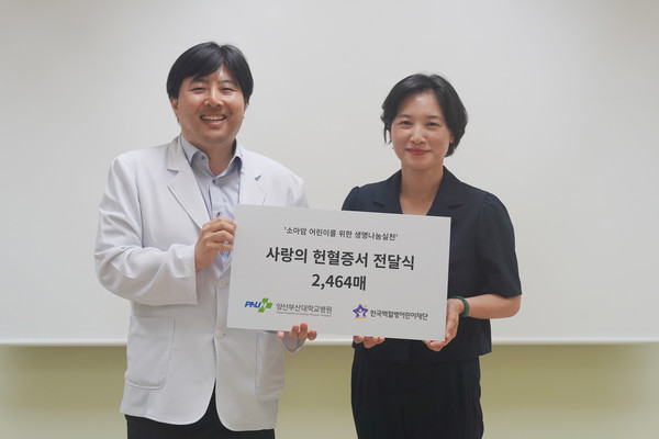 [뉴스인] 조진성 기자 = 양산부산대병원(병원장 이상돈)은 '세계 헌혈자의 날'을 맞아 한국백혈병어린이재단을 초대해 사랑의 헌혈증서 2464매를 전달했다.