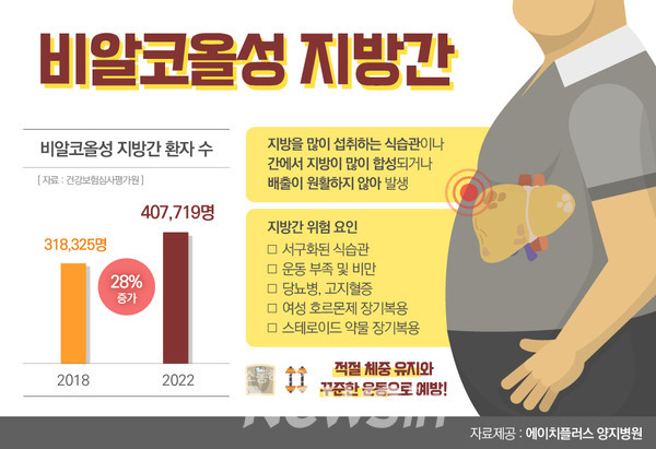 비알코올성 지방간의 한국인 유병률은 25~30%로, 국민건강심사평가원에 따르면 비알코올성 지방간으로 병원에서 진료받은 환자가 2018년 31만8325명이었는데 2022년에는 이보다 28%가량 증가한 40만7719명으로 조사됐다.