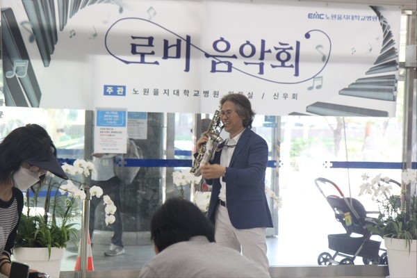 [뉴스인] 김태엽 기자 =노원을지대학교병원(병원장 유탁근)이 6월 19일 낮 12시 20분 6월 로비음악회를 열었다. 이번 공연은 색소포니스트 심삼종 교수를 초청해 감미로운 색소폰 소리가 로비를 가득 메웠다.