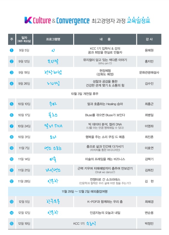서울교육대학교 KCC최고경영자과정(K-Culture Convergence)은 기존의 수동적인 강연형태에서 벗어나 문화예술을 직접 체험하는 즐거움에 집중해 삶의 질을 높일 수 있는 신나고 차별화된 프로그램으로 구성했다.