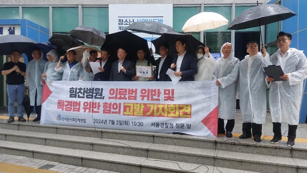 [뉴스인] 조진성 기자 = 범시민사회단체연합(이하 범사련, 회장 이갑산)이 2일 오전 10시30분 서울경찰청 정문앞에서 힘찬병원, 의료법 위반 및 특경법(특정경제가중처벌등에관한법률) 위반 혐의 고발 기자회견을 가졌다.