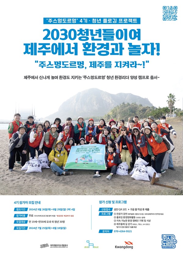 ‘주스멍 도르멍’ 4기 모집 대상은 만 19~30세의 제주 도내∙외 청년 총 30명이며, 8월 18일까지 포스터 내 QR코드를 통해 신청서를 제출하면 된다. 자세한 사항은 제주올레 공식 인스타그램 계정에서 확인할 수 있다. 선발된 참가자에게는 항공권을 제외한 식사, 숙박, 프로그램 참가비 전액과 친환경 기념품이 제공된다.