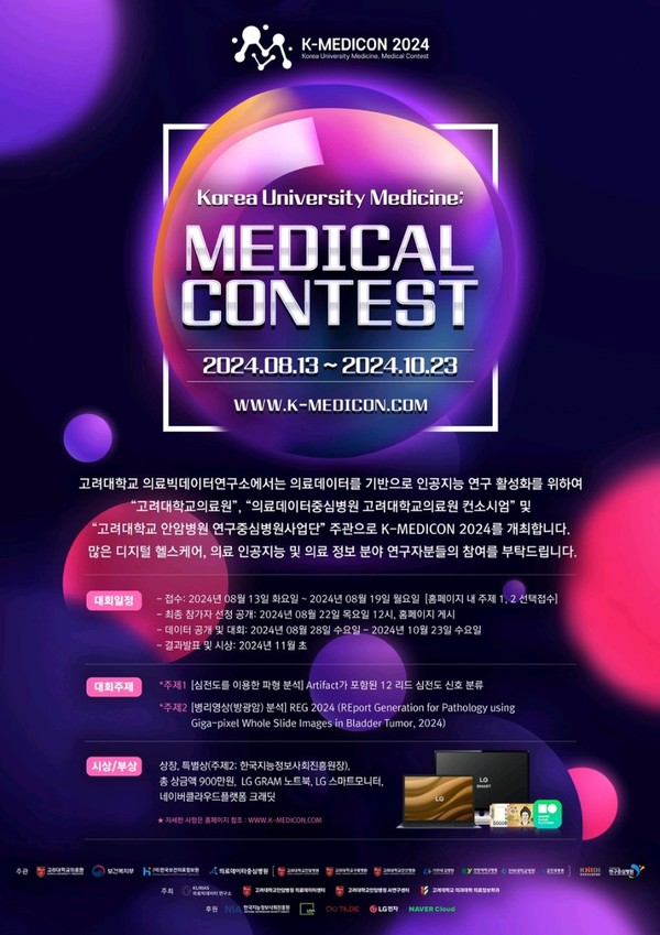 K-MEDICON 2024는 의료데이터중심병원 고려대학교의료원 컨소시엄, 안암병원 연구중심병원사업단, 보건복지부, 한국보건의료정보원, 한국보건산업진흥원 주관으로 진행되며, 고려대학교의료원 및 한국지능정보사회진흥원에서 제공하는 학습용 데이터를 바탕으로 진행된다. 주어진 주제에 따라 데이터를 분석하고, 그 결과를 등록해 평가 순위대로 수상자가 결정된다.