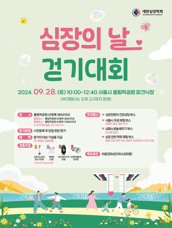 대한심장학회가 주최ㆍ주관하는 ‘심장의 날 걷기대회’는 작년에 이어 2024 심뇌혈관질환 예방관리 주간(9.1~9.7) 및 세계 심장의 날(9.29)을 기념해 심혈관질환에 대한 국민적 관심 제고와 효과적인 심혈관질환 예방법 중 하나인 걷기의 중요성을 알리기 위해 마련됐다.