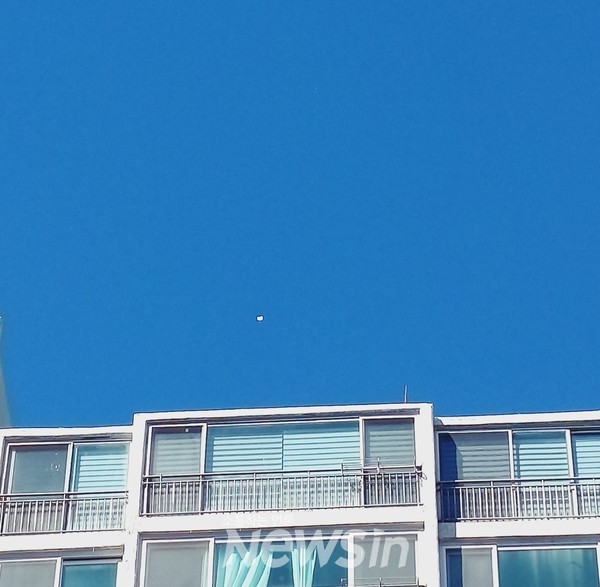 [뉴스인] 민경찬 기자 = 4일 오후 서울 강서구 방화동 상공에 북한의 오물풍선이 이동하는 모습이 관측되고 있다. (휴대전화 촬영)
