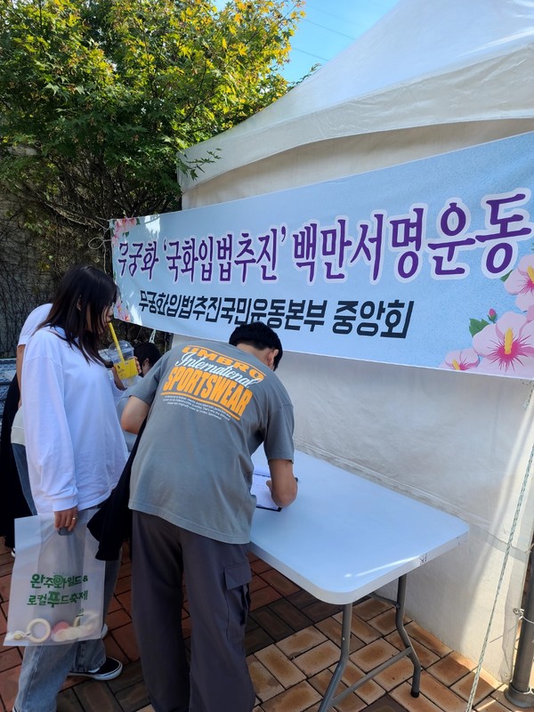 운동본부 중앙회 이정엽 회장은 지난 2일 김제 지평선 축제에 이어 4일 완주군의 배려로 서명부스까지 배정받아 '무궁화 국화입법' 서명운동을 전개하고 있다며, 지역주민과 관람객들의 적극적인 호응에 감사하다고 밝혔다.