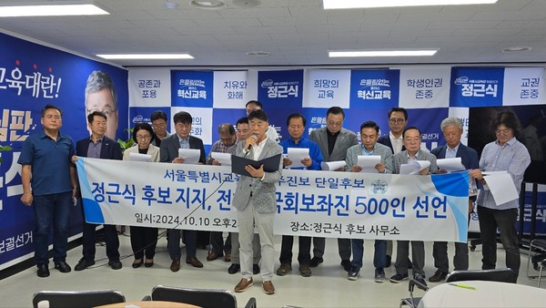 [뉴스인] 조진성 기자 = 10일 오후 2시30분 전직 국회 보좌진 500인이 서울시 마포구 소재 서울특별시교육감 보궐선거에 출마한 정근식 민주진보 단일후보 사무실에서 정후보의 지지를 선언했다.