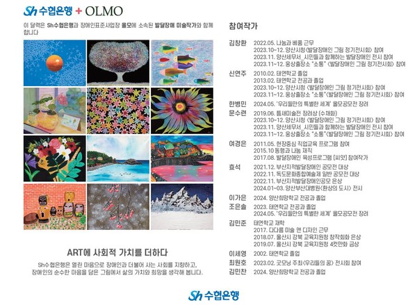 수협은행과 장애인 표준사업장 ‘올모(OLMO)’가 협업해 제작한 2025년 아트 캘린더에는 올모 소속 발달장애인 아티스트 12인의 작품이 삽입됐다.