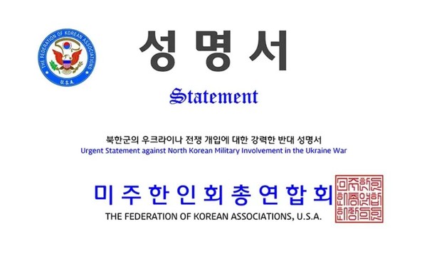 미주총연은 지난 28일 성명서를 통해 북한의 러시아-우크라이나 전쟁 참전은 ▲국제 안보 위협 ▲인도적 위기 증폭 ▲지역 안정 위협 등의 이유를 들어 북한군의 전쟁 개입을 강력히 규탄했다.