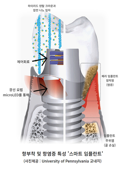 ‘스마트 임플란트’는 나노입자 화합물(바륨 티타네이트)를 활용하여 박테리아와 염증 및 감염으로부터 조직을 보호하는 보이지 않는 근적외선 빛을 자체적으로 공급하여 방출하며, 이 근적외선 빛은 구강 세포를 자극하여 박테리아를 죽이는 단백질과 염증을 감소시키는 생물질들의 형성을 촉진시킨다.