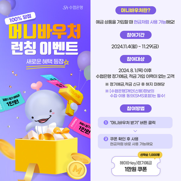 한편 수협은행은 머니바우처 론칭을 기념해 모바일뱅킹 앱을 방문하는 선착순 고객 1천명에게 헤이(Hey)정기예금 가입시 사용할 수 있는 1만원권 쿠폰을 증정하는 이벤트를 진행한다.