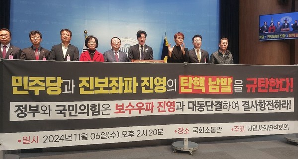 시민사회연석회의는 국민의힘과 대통령실의 날선 발언 등에 대해서도 성명을 내고 정부와 국민의힘 그리고 보수우파 진영에 대동단결을 촉구하며 민주당과 진보좌파 진영의 탄핵 남발 규탄 기자회견을 개최했다.