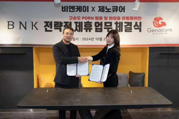 [뉴스인] 조진성 기자 = 재생의료 바이오 소재 전문 기업인 ㈜제노큐어(대표이사 오보경, 이하 제노큐어)는 지난달 29일 고품질의 스킨케어 화장품 전문 기업인 ㈜비앤케이(대표이사 김영훈 이하 BNK)와 ‘고순도 PDRN 원료 및 화장품 유통을’을 위한 전략적 업무 협약을 체결했다고 8일 밝혔다.