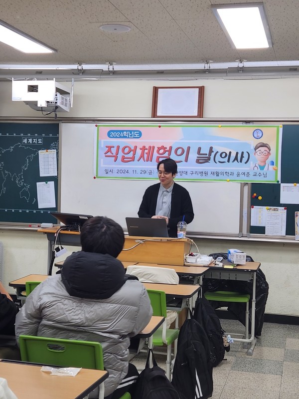 [뉴스인] 조진성 기자 = 한양대학교구리병원(원장 이승환)은 11월 29일 와부고등학교 ‘직업체험의 날’ 행사에서 교내 학생들을 대상으로 '의사'에 관한 직업을 소개하는 특강을 실시했다.