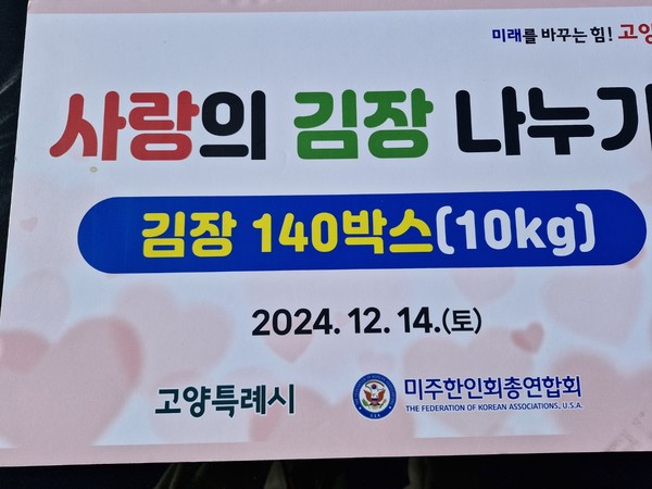 한편 미주총연 한국지부 '사랑의 김장 나눔' 행사는 뉴스인, (주)청조원, 우용태법무사, 아리랑글로벌 경제문화재단, 고양시호남향우회총연합회, (주)시온바이오, (주)가나폐차장, (주)진부ENC, (주)GK그룹, 건축사무소디딤, 정연법률사무소가 후원했다.